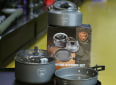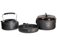 Campingová kuchyňská sada, která obsahuje konvičku, pánev a hrnec s pokličkou. Vše je vyrobeno z lehkého, eloxovaného hliníku a pro snadný transport vše pasuje do sebe.