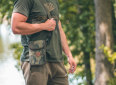 K dispozici je několik kapes k uložení, karet, povolenky, peněz, telefonu a pera atd. Dodáváno s odnímatelným ramenním popruhem. Vyroben z odolného a vodě odpudivého nylonu 210D, který je v decentním kamuflážovém vzoru.